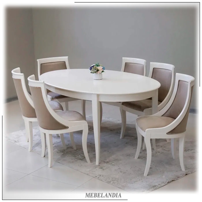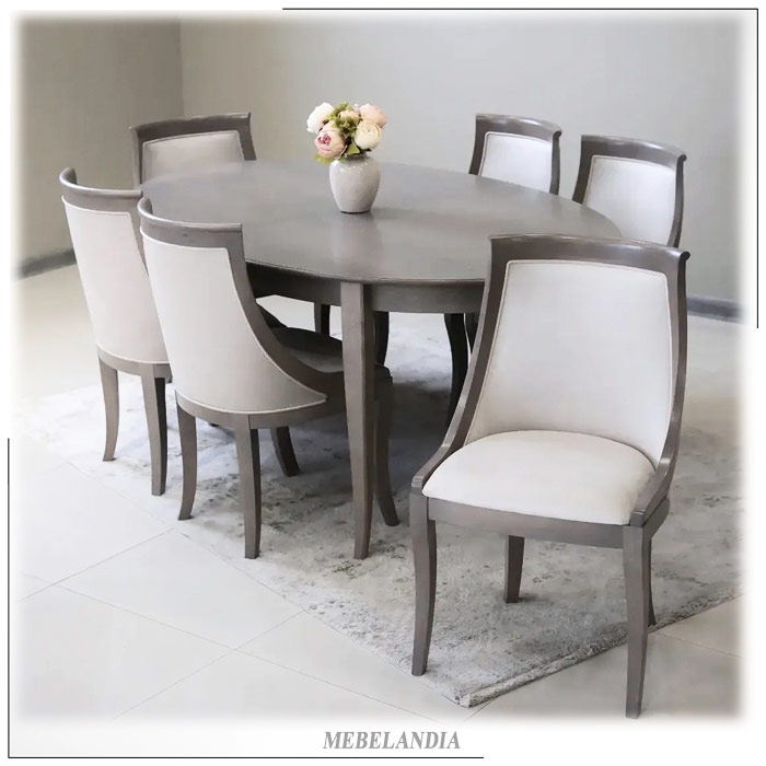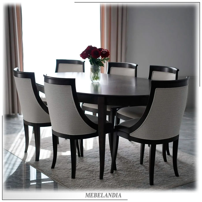 Совершенно вписывается в просторную гостиную или кухню, где неоклассика сочетает традиции с лаконичностью. Столешница рассчитана на 6–8 гостей, подчеркивая чистоту линий и матовый блеск дерева. Качественная отделка и анатомические спинки гарантируют удобство для повседневных встреч и праздников. Эта столовая зона воплощение элегантности, где прошлое встречает настоящее.